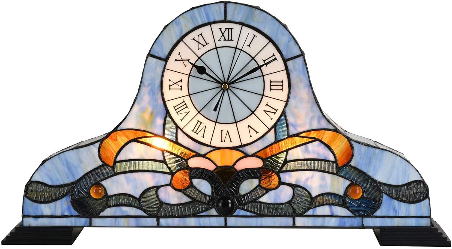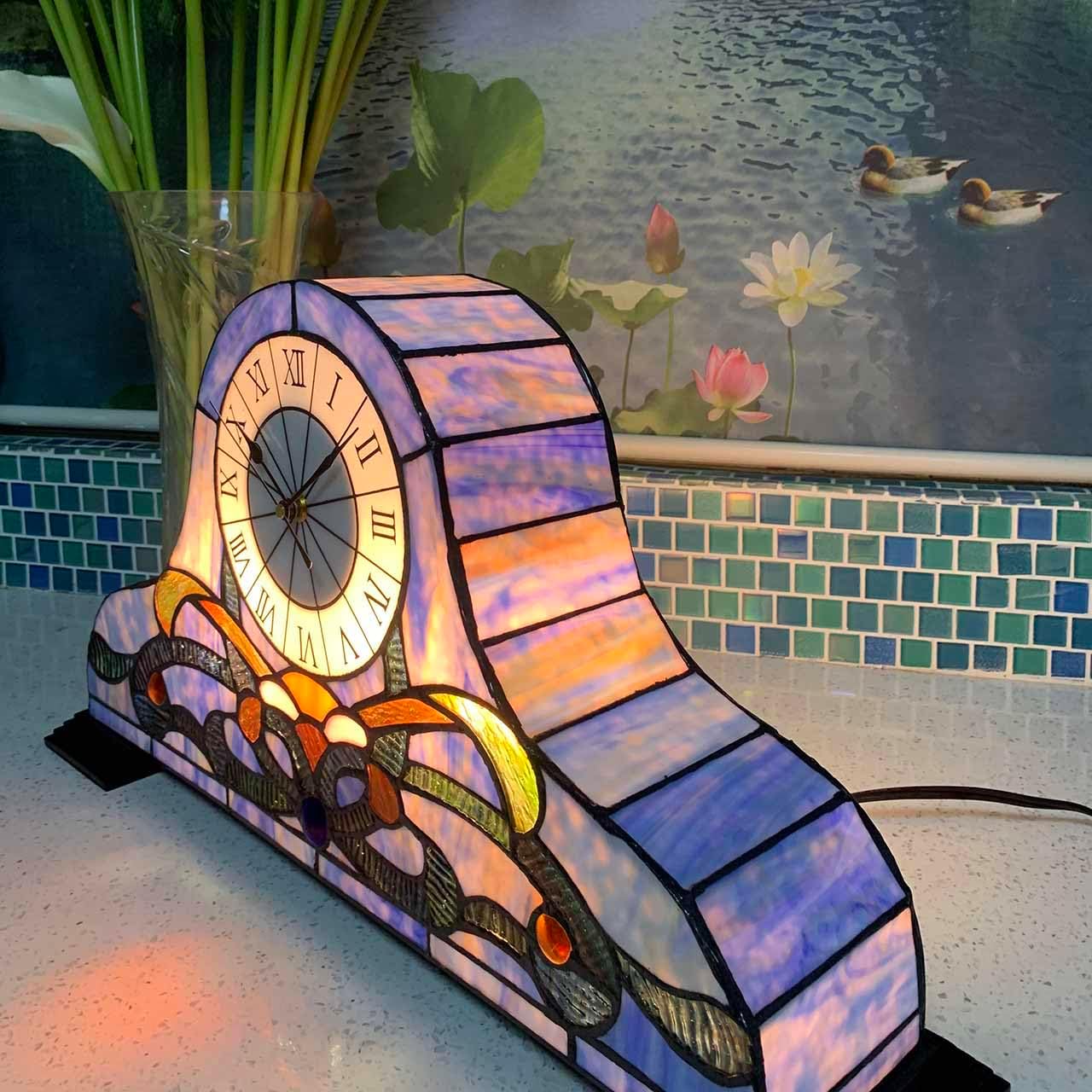 - This desk clock table lamp is made of stained glass. there is a Quartz watch movement inside. it looks gorgeous when you place it on your furniture. you definitely will receive many compliments.