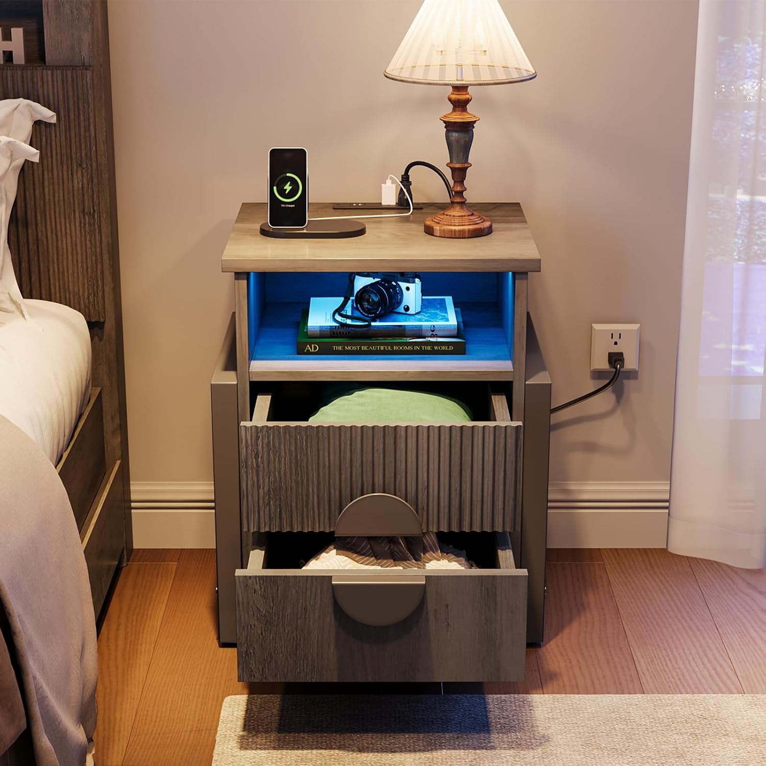 - To enhance the smart bed side table further add a remote LED strip light, to help shed subtle light on the contents. Also you can use the USB Outlets on the top of dresser to charge your mobile phone or lamp without taking up too much storage space on the top.