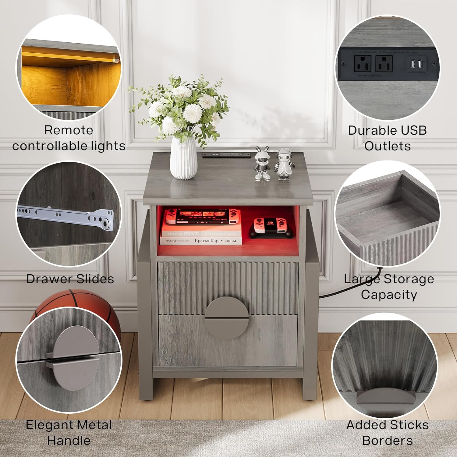 LGHM Fluted Nightstand Set of 2 with Charger Station, Strip Lights,Night Stand with 2 Drawers, Accent Bed Side Table and End Table,Curved Profile Design, Raising H Legs for Bedroom, Living Room,Gray